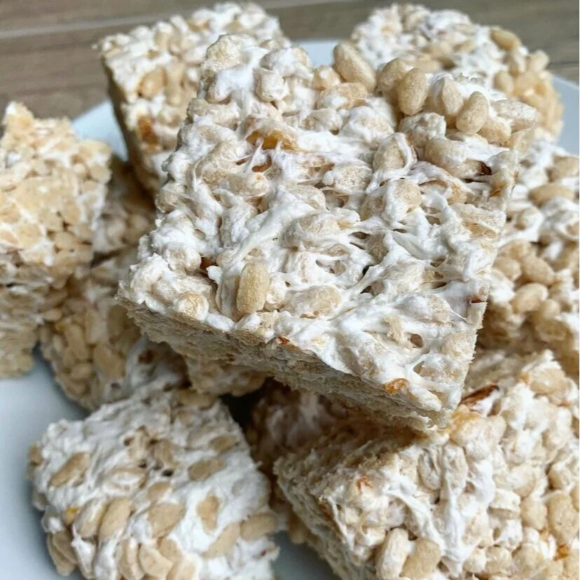 I truly believe homemade Rice Krispies Treats are the ULTIMATE comfort food. They have the perfect combo of satisfaction, childhood memories, and the miraculous ability to remove all stress from the day (kind of…). I mean just look at that ooey gooey marshmallow goodness stretching across all those little crunchy crispies! This recipe is SO simple to make, and follows the OG protocol with a few ingredient substitutions (totally optional - see below for subs you can make for the same result!).